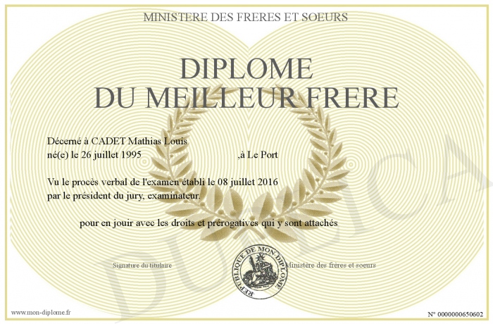 Envoyez par email votre Diplôme du Meilleur Frère personalisé