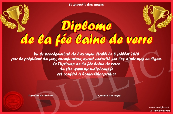 Envoyez par email votre Diplôme de la fée laine de verre personalisé