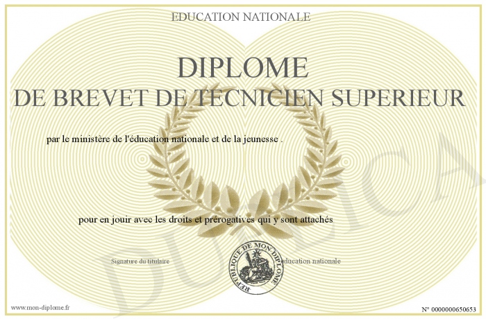 Envoyez par email votre diplome de brevet de tecnicien supérieur personalisé