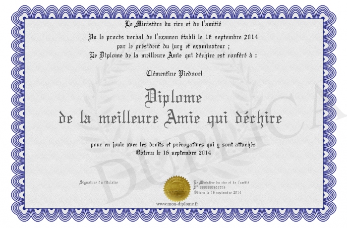 Envoyez par email votre Diplome de la meilleure Amie qui déchire personalisé