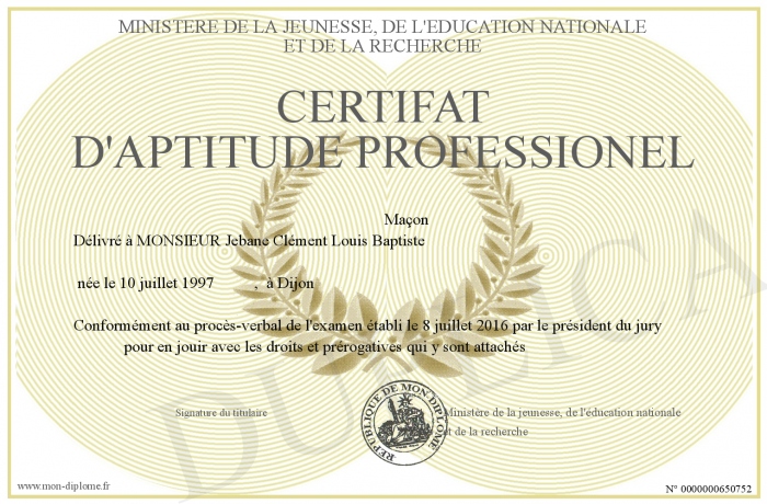 Envoyez par email votre certifat d'aptitude professionel personalisé