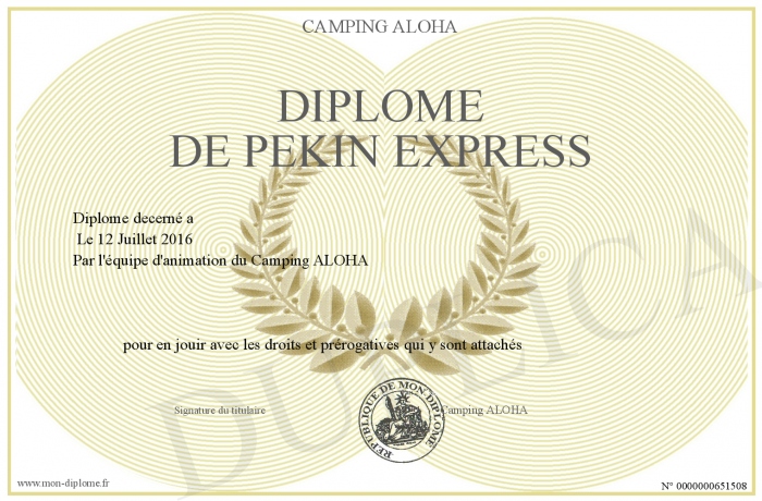 Envoyez par email votre Diplôme de Pékin Express personalisé
