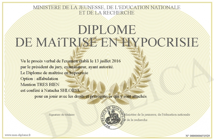 Envoyez par email votre Diplôme de maîtrise en hypocrisie personalisé
