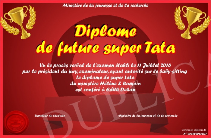 Envoyez par email votre Diplôme de future super Tata personalisé