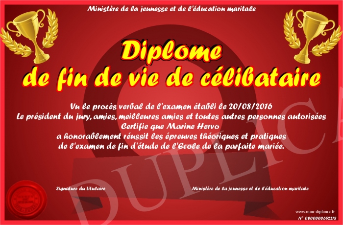 Envoyez par email votre Diplôme de fin de vie de célibataire personalisé