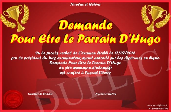 Envoyez par email votre Demande Pour Etre Le Parrain D'Hugo personalisé