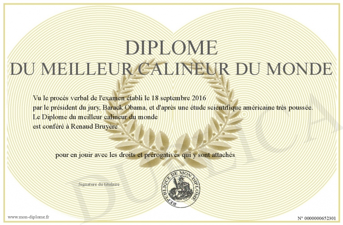 Envoyez par email votre Diplôme du meilleur calineur du monde personalisé
