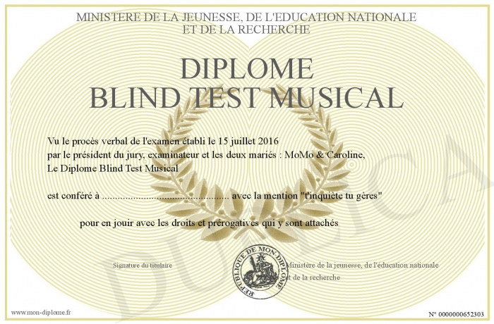 Envoyez par email votre Diplôme Blind Test Musical personalisé