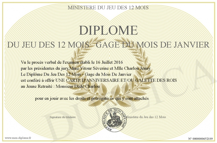 Envoyez par email votre Diplôme Du Jeu Des 12 Mois Gage du Mois De Janvier personalisé
