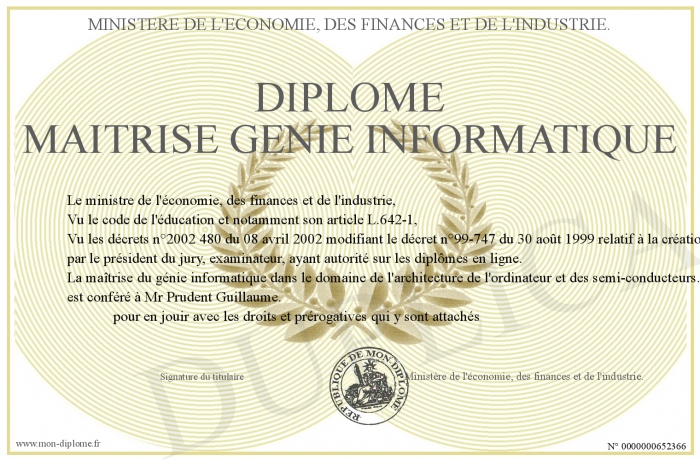 Envoyez par email votre Diplôme maitrise génie informatique personalisé