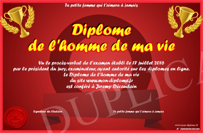 Envoyez par email votre Diplôme de l'homme de ma vie personalisé