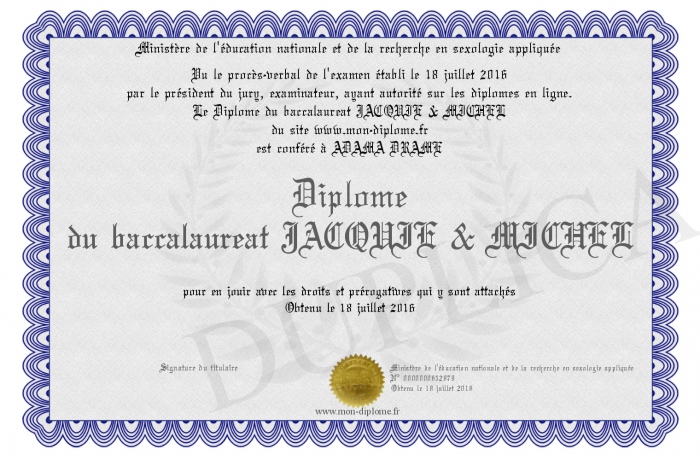 Envoyez par email votre Diplôme du baccalaureat JACQUIE & MICHEL personalisé