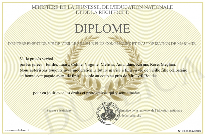 Envoyez par email votre diplôme d'enterrement de vie de vieille fille le plus compliquée et d'autorisation de mariage personalisé