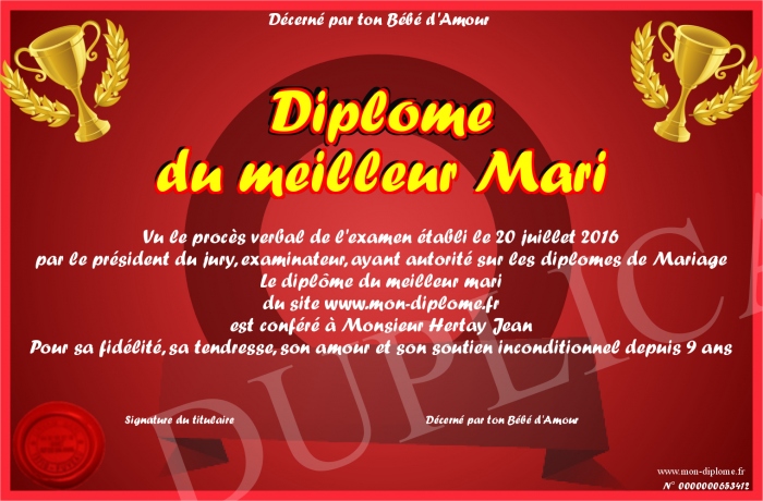 Envoyez par email votre Diplôme du meilleur Mari personalisé