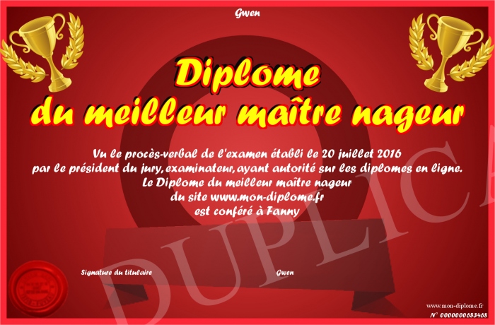Envoyez par email votre Diplôme du meilleur maître nageur personalisé