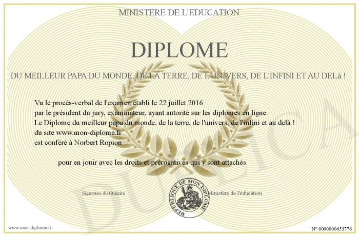Envoyez par email votre Diplôme du meilleur papa du monde, de la terre, de l'univers, de l'infini et au delà ! personalisé