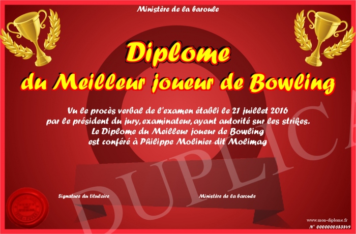 Envoyez par email votre Diplôme du Meilleur joueur de Bowling personalisé
