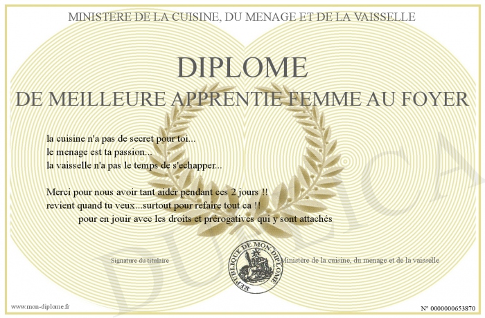 Envoyez par email votre diplome de meilleure apprentie femme au foyer personalisé