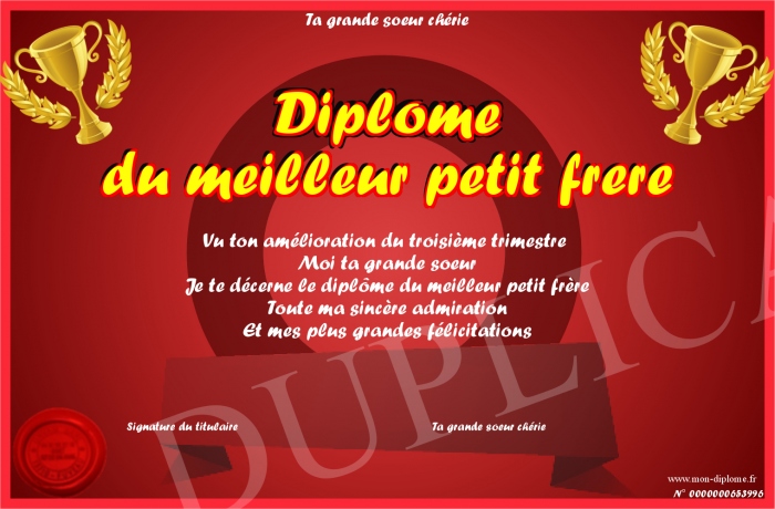 Envoyez par email votre Diplôme du meilleur petit frere personalisé