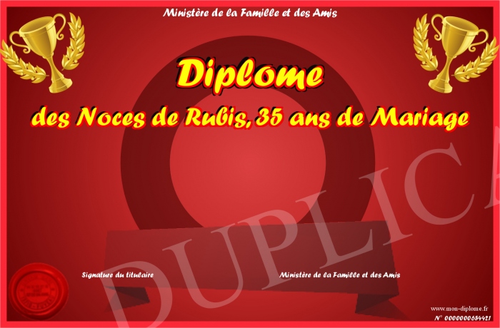 Envoyez par email votre Diplôme des Noces de Rubis, 35 ans de Mariage personalisé