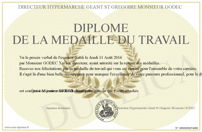 Envoyez par email votre Diplôme de la médaille du travail personalisé