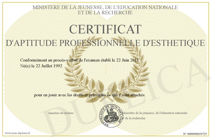 Envoyez par email votre CERTIFICAT D'APTITUDE PROFESSIONNELLE D'ESTHETIQUE personalisé