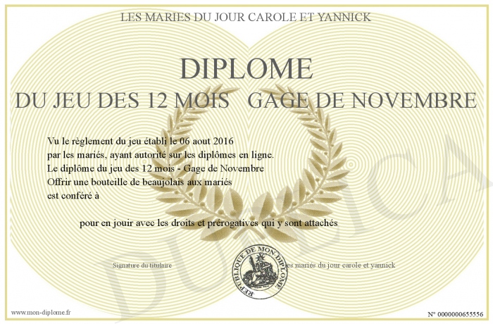 Envoyez par email votre Diplôme du jeu des 12 mois gage de novembre personalisé