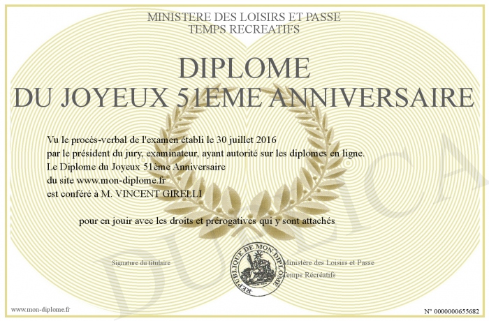 Envoyez par email votre Diplôme du Joyeux 51ème Anniversaire personalisé