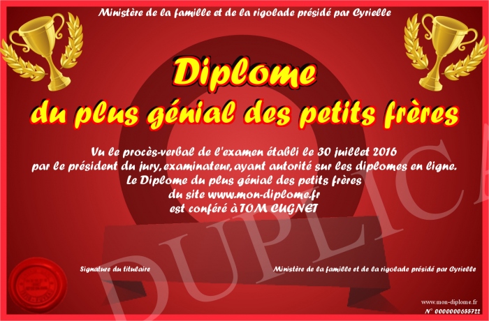Envoyez par email votre Diplôme du plus génial des petits frères personalisé