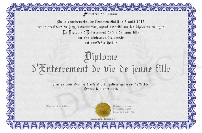 Envoyez par email votre Diplome d'Enterrement de vie de jeune fille personalisé
