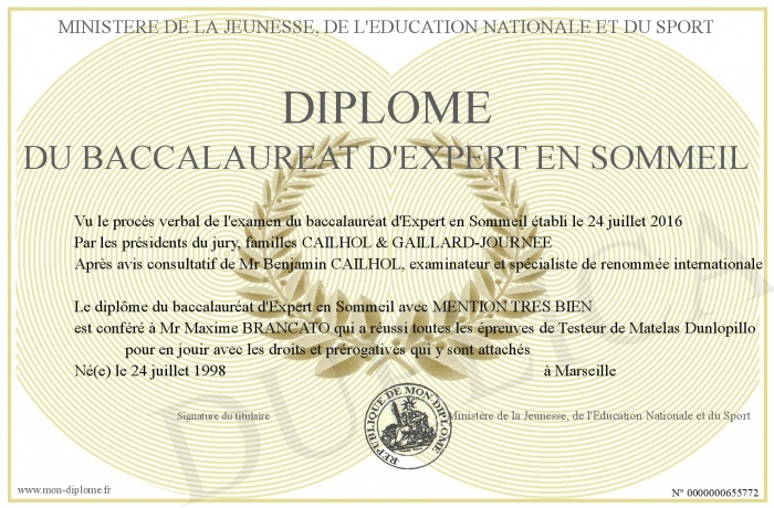 Envoyez par email votre Diplôme du baccalaureat d'Expert en Sommeil personalisé