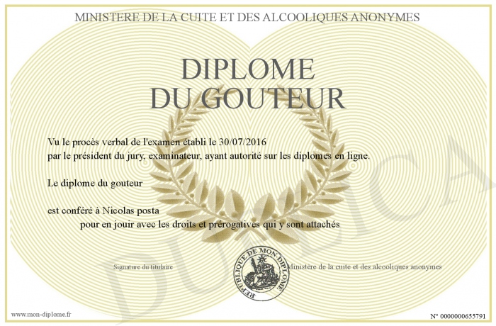 Envoyez par email votre Diplôme du gouteur personalisé