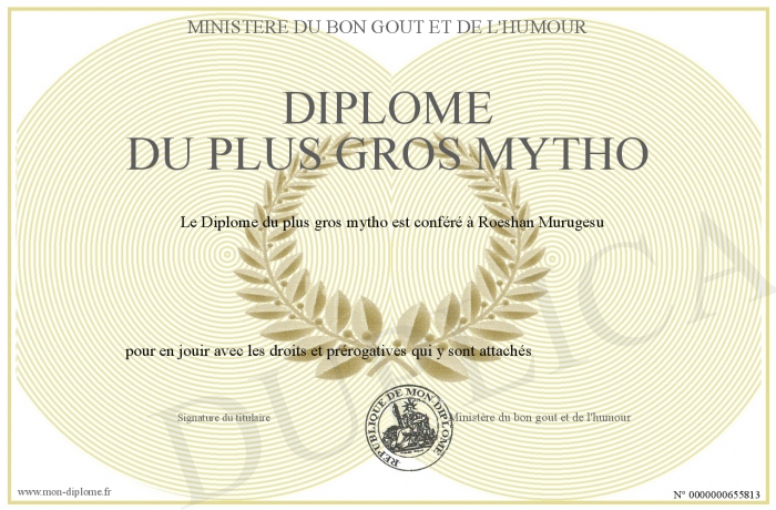 Envoyez par email votre Diplôme du plus gros mytho personalisé