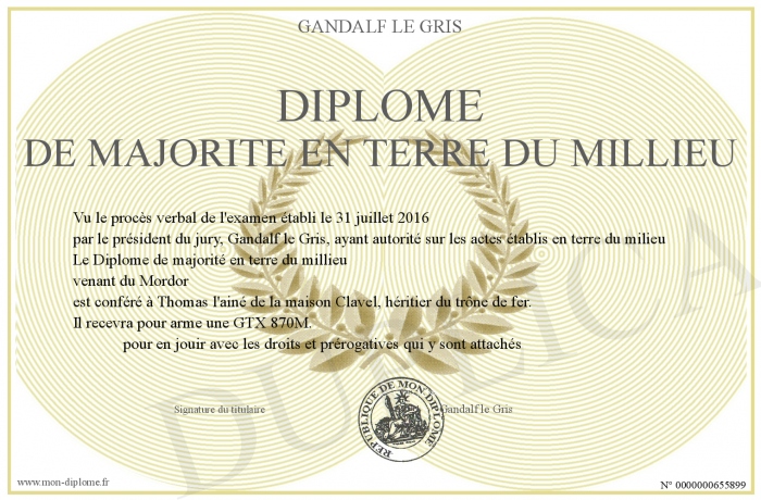 Envoyez par email votre Diplôme de majorité en terre du millieu personalisé