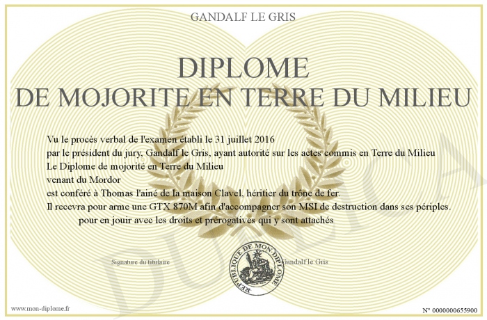 Envoyez par email votre Diplôme de mojorité en Terre du Milieu personalisé