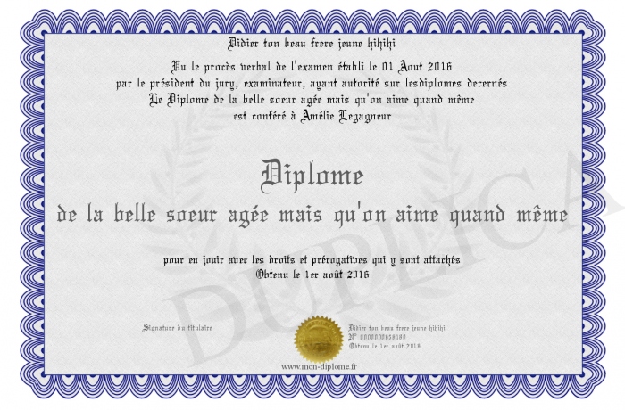 Envoyez par email votre Diplôme de la belle soeur agée mais qu'on aime quand même personalisé