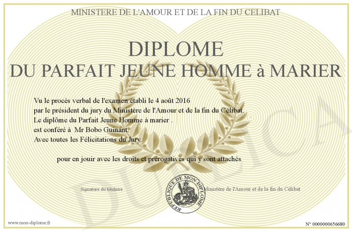 Envoyez par email votre Diplôme du parfait jeune homme à marier personalisé
