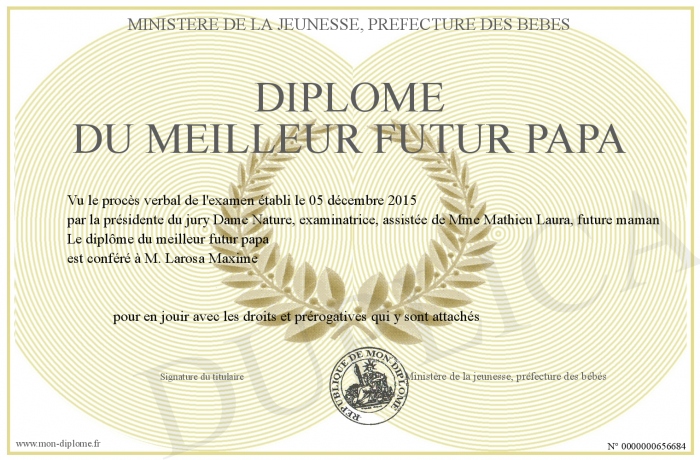 Envoyez par email votre Diplôme du meilleur futur papa personalisé