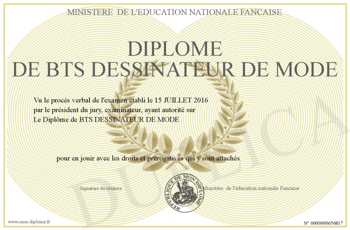 Envoyez par email votre Diplôme de BTS DESSINATEUR DE MODE personalisé