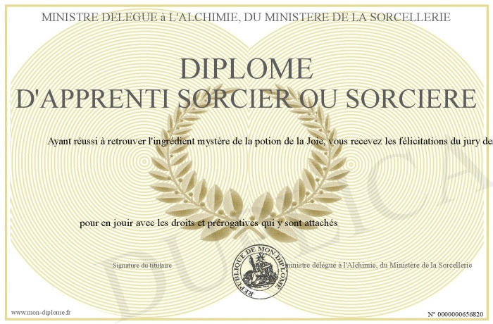 Envoyez par email votre Diplôme d'apprenti sorcier ou sorcière personalisé