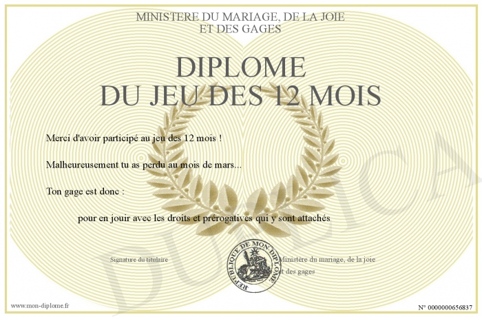 Envoyez par email votre Diplôme du jeu des 12 mois personalisé