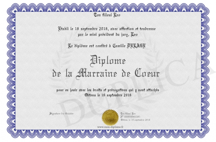 Envoyez par email votre Diplôme de la Marraine de Coeur personalisé