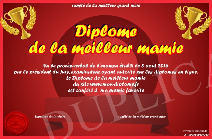 Envoyez par email votre Diplome de la meilleur mamie personalisé