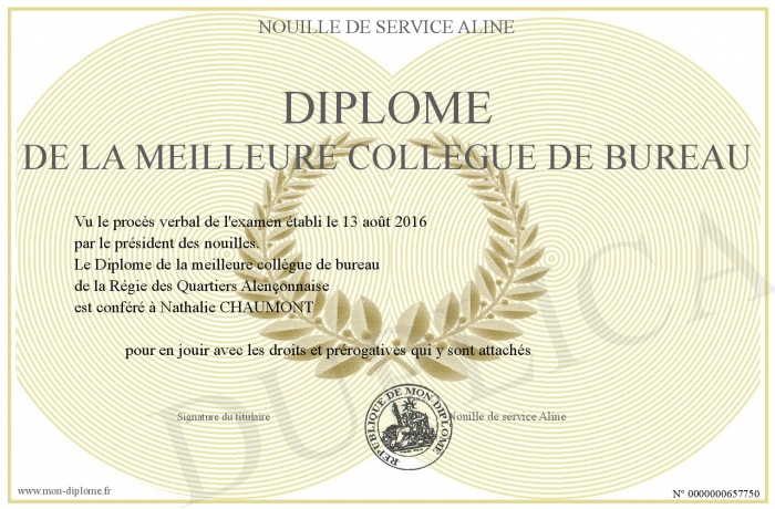 Envoyez par email votre Diplôme de la meilleure collègue de bureau personalisé