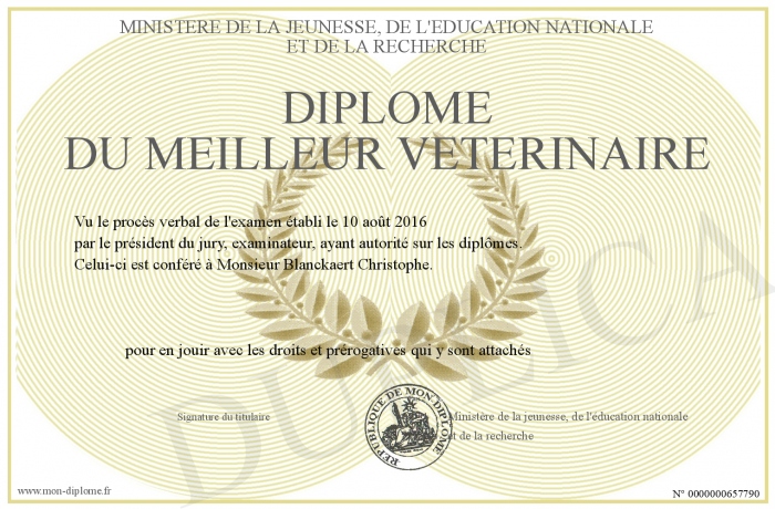 Envoyez par email votre Diplôme du Meilleur vétérinaire personalisé