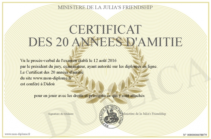 Envoyez par email votre Certificat des 20 années d'amitié personalisé
