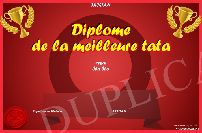 Envoyez par email votre Diplome de la meilleure tata personalisé