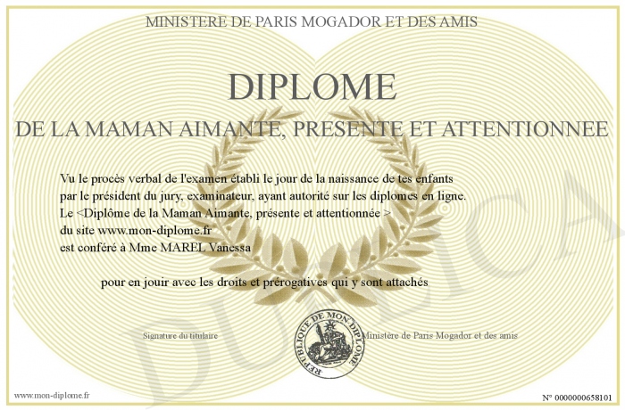 Envoyez par email votre Diplôme de la Maman Aimante, Présente et Attentionnée personalisé