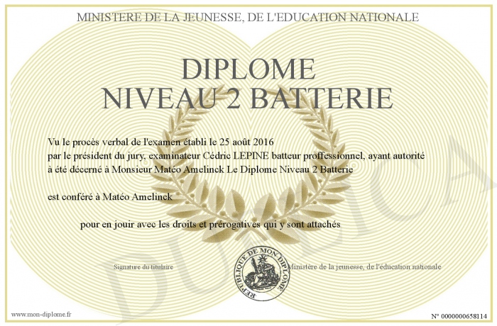 Envoyez par email votre Diplôme Niveau 2 Batterie personalisé