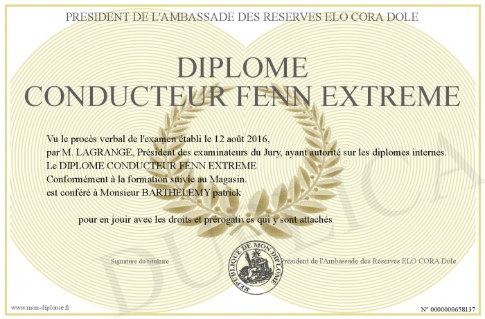 Envoyez par email votre DIPLOME CONDUCTEUR FENN EXTREME personalisé